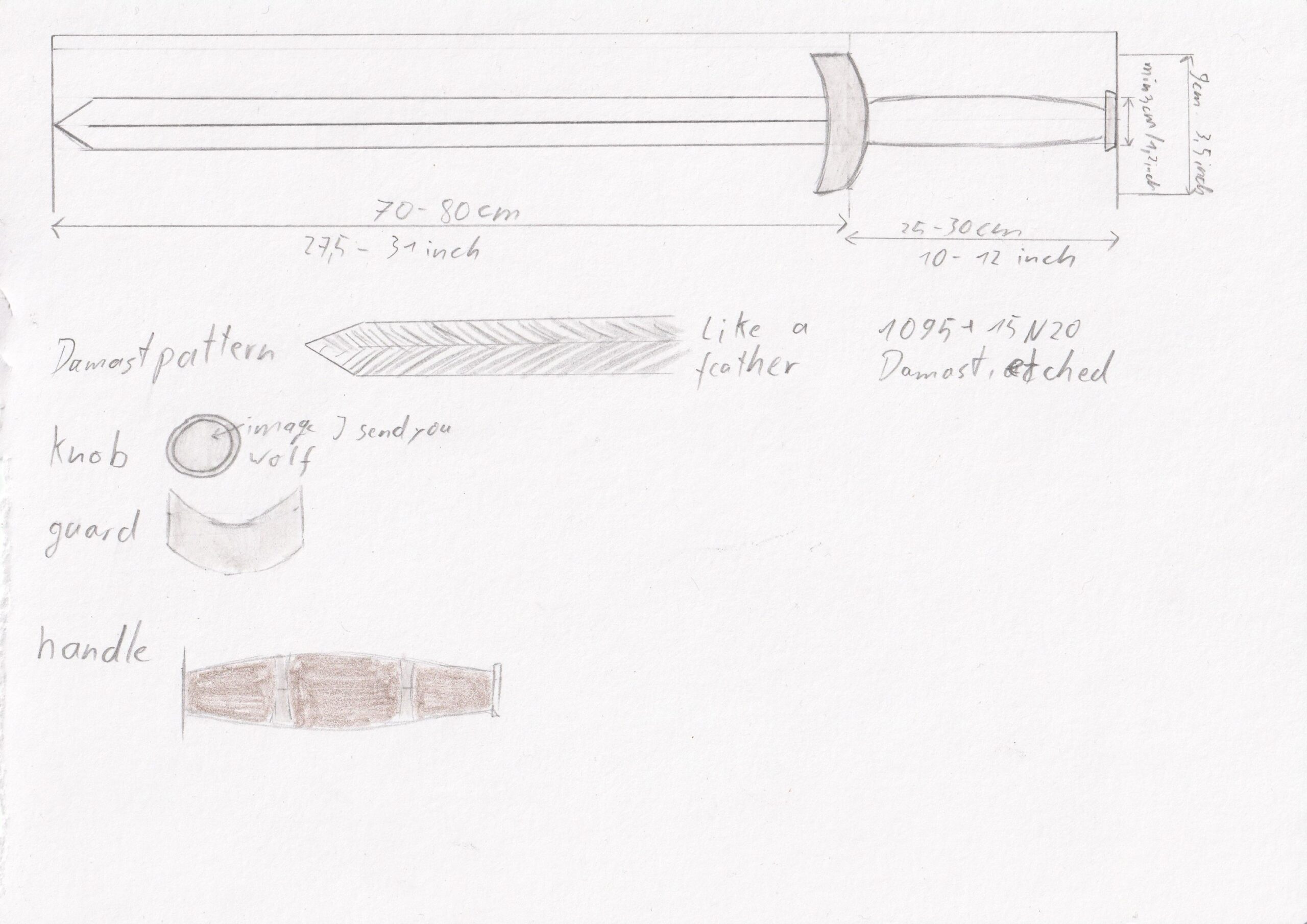 The handle measures 25–30 cm and is crafted from dark hardwood, providing a comfortable grip and classic aesthetic. The guard and pommel are made from brass, complementing the dark handle and Damascus blade. The guard features hand engraved wave patterns, while the pommel includes a custom engraved wolf with oak leaves, designed so it can also function as an embossing stamp.